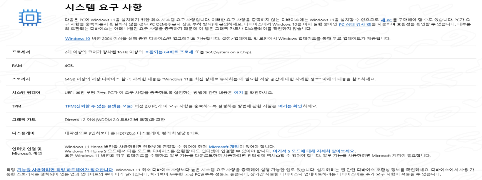 ↑Windows 11 설치를 위한 시스템 요구 사항