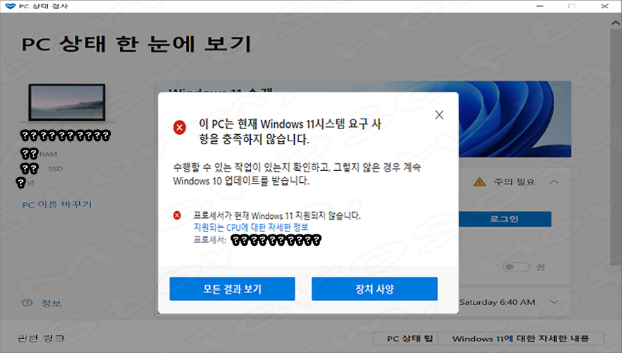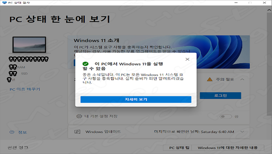 10. 설치가 가능할 경우↓아래와 같은 화면이 나타납니다. (? 표시는 PC 이름과 사양을 나타내며, 다를 수 있습니다.)