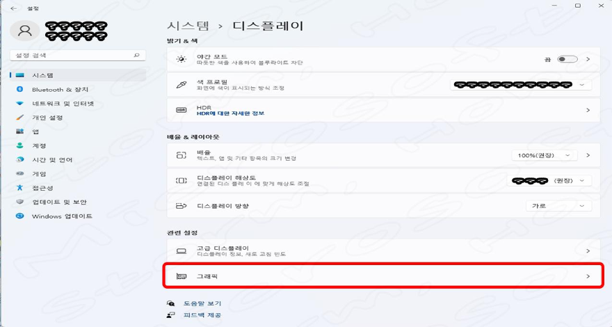 5. 아래로 스크롤하여 '그래픽'을 선택합니다. 설치되어 있는 그래픽 카드가 '하드웨어 가속 GPU 스케줄링' 을 사용하는 그래픽카드 (GPU) 인지에 따라, 화면이 다르게 나타납니다.