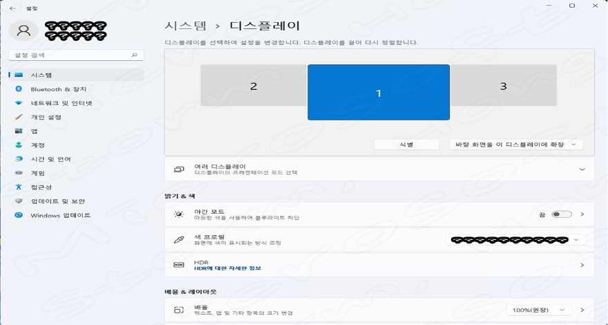 3. 디스플레이를 선택하면 다음과 같은 화면이 나오며 색 프로필에 자신의 모니터가 설정이 보입니다.