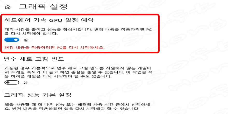 * Windows 10 에서 보이는 '하드웨어 가속 GPU 스케줄링' 화면
