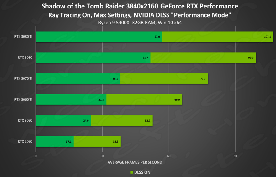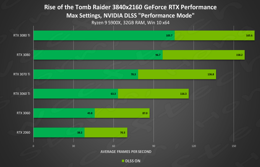 NVIDIA DLSS 2.0은 Rise of the Tomb Raider와 Shadow of the Tomb Raider 에도 제공되어 이전 게임에서 DLSS는 성능 모드를 사용하여 4K에서 평균 FPS를 최대 75%까지 향상한다고 전해졌습니다.