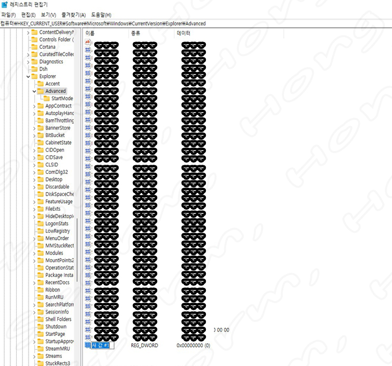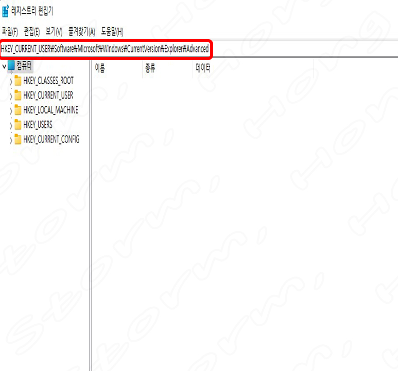 2. 다음과 같이 주소줄에 HKEY_CURRENT_USER\Software\Microsoft\Windows\CurrentVersion\Explorer\Advanced 를 넣고 '엔터' 를 눌러줍니다.