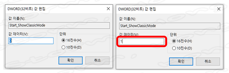 Start_ShowClassicMode 의 값을 위의 수정과 같이 DWORD(32비트) 값 편집에서 1을 다시 0으로 바꾸어 주고 재부팅을 실시합니다.
