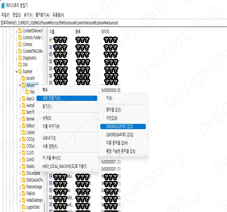 3. ① 이름 종류 탭 왼쪽에 있는 리스트 부분에서 폴더의 'Advanced' 를 찾은 후 ② '오른쪽 마우스 버튼'을 누른 다음 ③ '새로 만들기' 를 찾아 그림과 같이 'DWORD 키' 를 눌러 줍니다. (??? 물음표는 값의 이름, 종류, 데이터 값을 가린 내용입니다. 설정에 따라 다를 수 있습니다.)