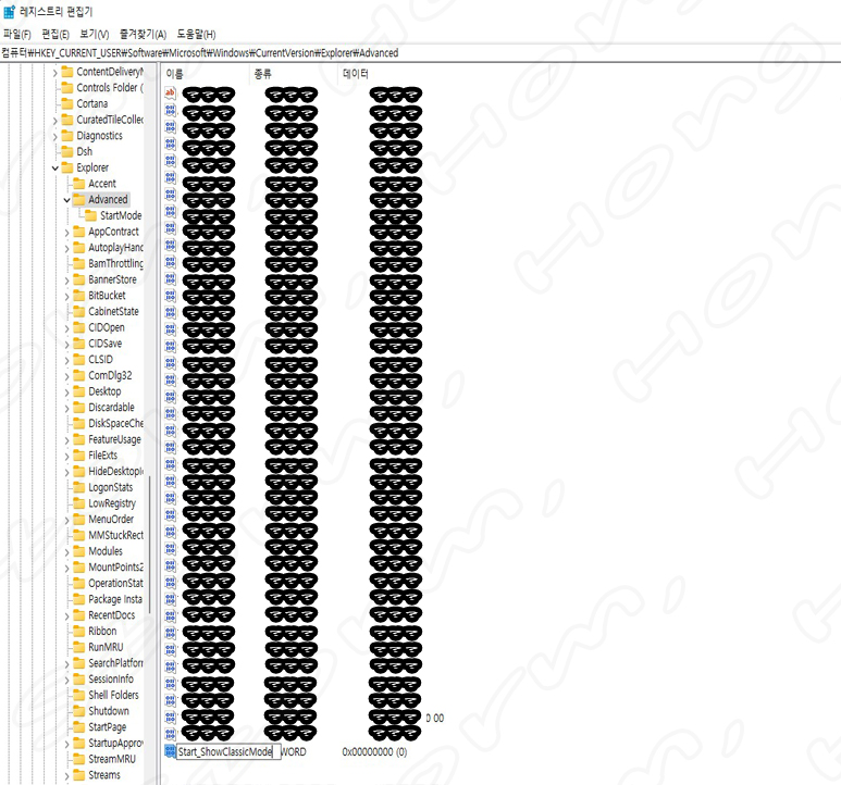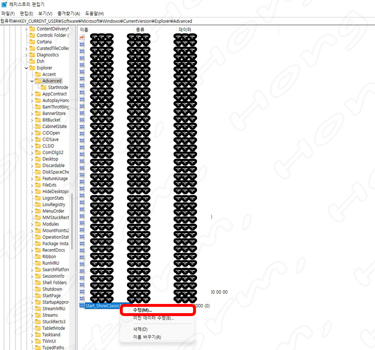 6. ↓아래 사진과 같이 Start_ShowClassicMode 이름이라는 방금 만든 값을 클릭한 후 오른쪽 마우스를 클릭해 줍니다. (??? 물음표는 값의 이름, 종류, 데이터 값을 가린 내용입니다. 설정에 따라 다를 수 있습니다.)