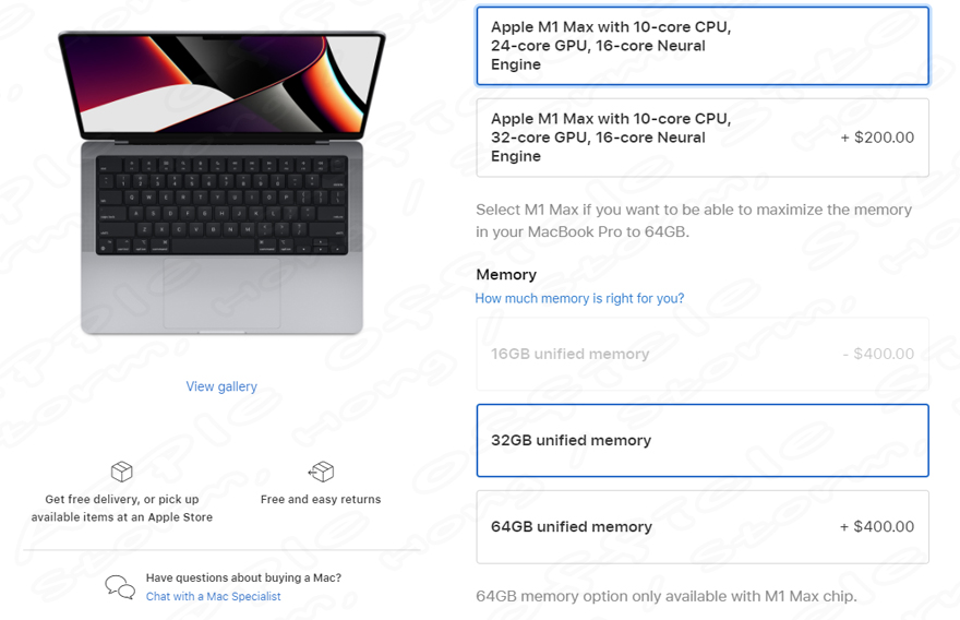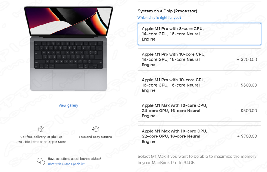 이에 맞추어 RAM 추가 옵션 중 최종 옵션인 64GB 모델 옵션이 있다고 합니다. 하지만 이 옵션의 선택을 하려면 M1 Max 모델로 CPU 선택을 해야 64GB RAM의 선택이 가능하다고 합니다. 그러나 M1 Pro 노트북을 구매한다면 최대 32GB의 RAM만 구성할 수 있다고 합니다. 그러나 14인치 기본 8 코어 CPU 14 코어 GPU 모델에서 M1 Max 칩으로 업그레이드를 하려면 10 코어 CPU 24 코어의 GPU의 경우 USD 500 ($) , 10 코어 CPU 32 코어의 GPU의 경우 USD 700 ($) 의 가격이 추가됩니다. 이때 자동으로 32GB RAM 으로 자동으로 올라가며, USD 400 ($) 를 추가로 지출하면 M1 Max 와 64GB RAM이 탑재된다고 합니다. 최종적으로 가격은 USD 1,100 ($) 의 가격이 필요하며 이 옵션은 2021년 10월 18일 적용된 내용이며, 14인치, 16인치 2021년 MacBook Pro 모델에 적용된다고 합니다.