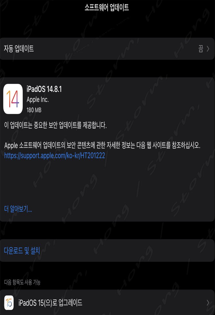 iPadOS 14.8.1 설치 공간은 180 MB 입니다. (설치용량은 각 이전에 업데이트하지 않으신 분들은 더 큰 용량일 수 있습니다.) 이전의 iPadOS 14.8 / iPadOS 14.8 이전의 업데이트를 하지 않으신 분들은 한꺼번에 설치해야 하므로 용량이 클 수 있습니다. 아래에 있는 Upgrad to iOS 15를 누르면 15.1로 업그레이드가 가능합니다. 만일 아래와 같은 업데이트 화면이 나오지 않는 분들도 iOS 14 버전이 설치되어있으면 iOS 14.8.1로 업그레이드가 가능합니다.