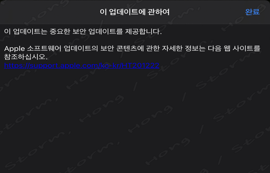 애플 보안 사이트 문서의 내용은 Apple은 고객 보호를 위해 보안 문제에 관한 조사를 마치고 패치 또는 출시 버전을 일반에 공개할 수 있을 때까지는 보안 문제를 공개하거나, 논의하거나, 확인해 주지 않습니다. 이 문서에는 최신 출시 버전이 나와 있습니다. 이를 통해 자신에 맞는 기기의 업데이트 버전을 설명받으시면 됩니다.