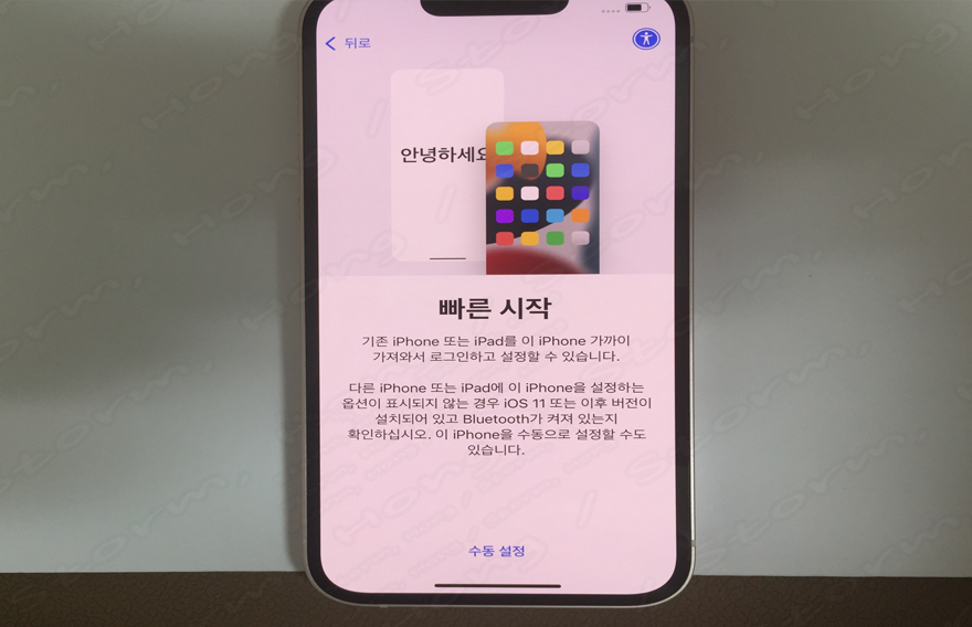 2. 새로 구매한 아이폰에 전원을 연결하거나 전원을 눌러 켜줍니다. 또는 데이터를 지운 아이폰을 재부팅시켜 줍니다. 그러면 다음과 같은 화면이 나타납니다.