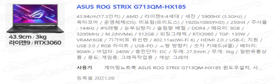 ↑ danawa.com ASUS ROG STRIX G17QM-HX185 검색
