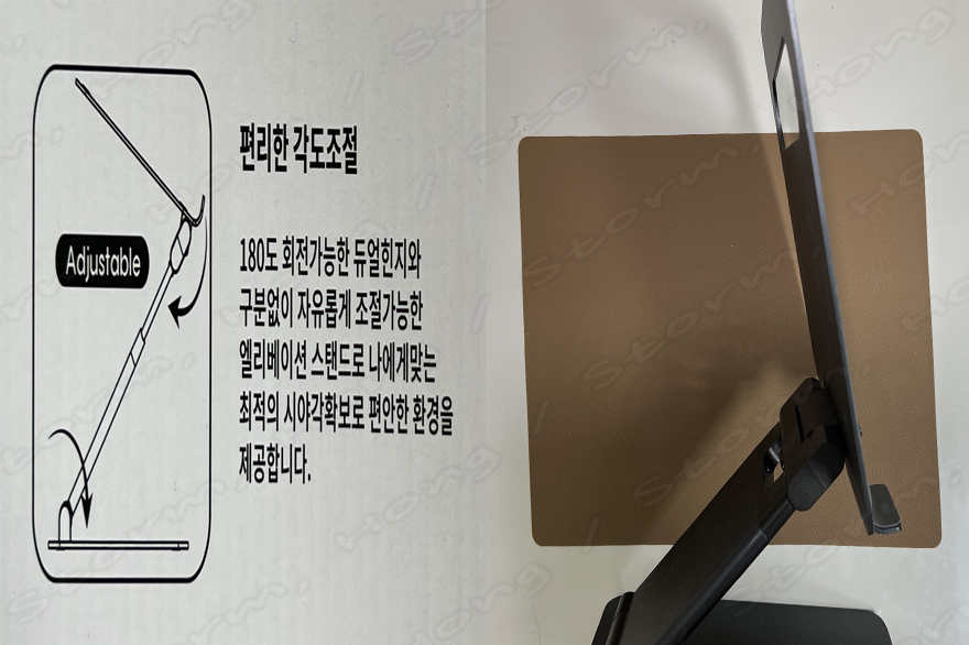 4장의 사진으로써 크기를 비교해보면 왼쪽 사진들을 보았을 때, 두 제품에서 노트북 등 아이패드의 크기에 따라 미끌림 방지 패드가 4개의 모퉁이 에있으며, 흘러내림 방지를 할 수 있는 폴딩 처리, 스크래치 방지용 논슬립 실리콘을 통해 아이패드 및 노트북 등이 흘러내리지 않게 잡아주는 역할을 합니다. 또한 판의 중간에는 뚫려있는 공간을 통하여, 공기 순환 홀을 만들어 주는 역할을 해주며, 노트북 등에 쿨링을 할 수 있도록 신경을 쓴 모습이 독 보이는 제품입니다.