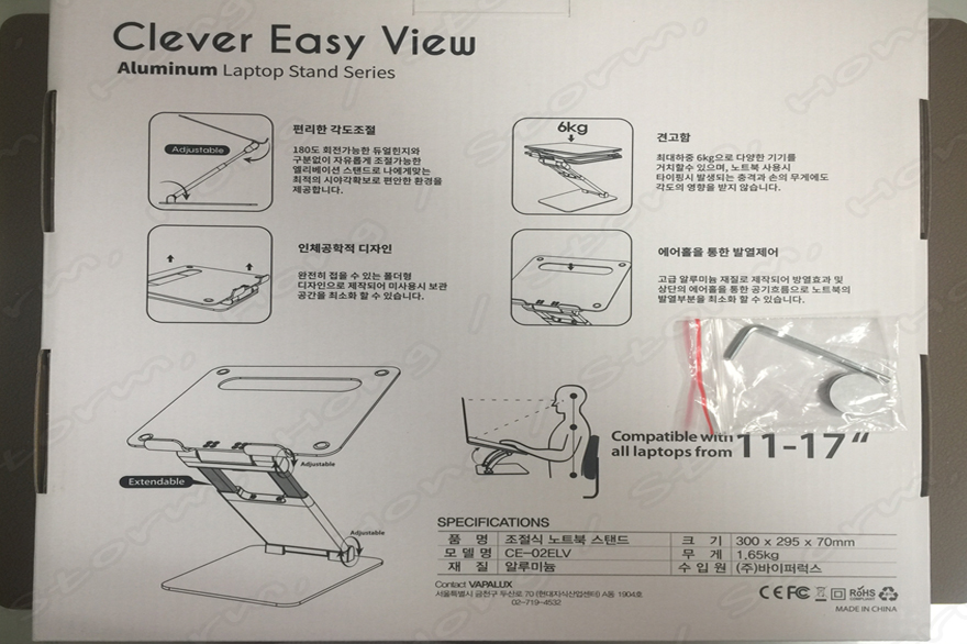 그러나 사무실이나, 집 등에서 거치해놓고 노트북만 이동해서 사용할 수 있는 장점이 있어, 하나씩 구매해두고 사용하기에는 정말 유용한 제품입니다. 그리고 VPLUX Clever View CE-02 ELV는 전작 VPLUX Clever View CE-02와 다른 2단으로 높이를 높이고 각도를 조금 더 높여 앉아서 사용하거나 키가 큰사람 그리고 서서 작업을 할 수 있다는 장점이 큰 제품입니다.