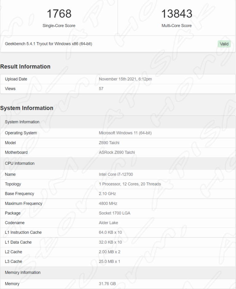 intel Core i7-127000(F) 는 12 코어 20 스레드 및 25MB의 L3 캐시를 특징으로 한다고 합니다. 클럭 속도는 P-Core의 경우 2.10 GHz 베이스, E-Core의 경우 1.60 GHz 베이스, 65W TDP에서 최대 부스트 클럭 4.90 GHz로 부스트 클럭으로 동작을 한다고 알려졌습니다. Geekbench 5 데이터베이스는 최대 4.8GHz의 증가를 보였으며, 전체 4.9 GHz 에서 근접한 수치입니다. 테스트 시스템에는 ASRock Z690 타이치 메인보드와 32GB DDR5 메모리가 창착되어 테스트가 진행되었습니다. CPU는 65W의 기본 TDP와 약 150W의 최대 터보 출력의 특징으로 했습니다.