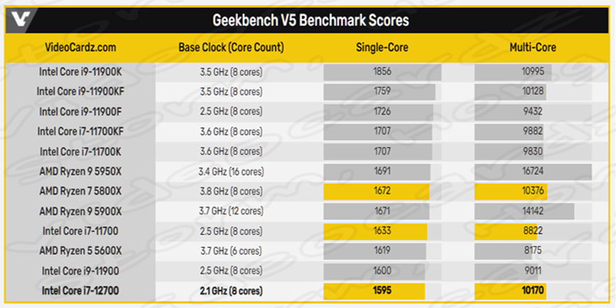 성능면에서 intel Core i7-12700는 싱글코어 점수는 1768점, 멀티코어 점수는 13,843점을 기록했습니다. 전작인 Core i7-11700과 비교했을 때 멀티코어에서 57%, 싱글코어에서 9% 향상된 성능이라고 합니다. 이 칩은 잠금 헤제 제품인 i7-11700K 보다 40% 더 빠른 것으로 알려졌습니다. AMD Ryzen 7 5800X 보다도 33%의 멀티 코어 향상과 6%의 싱글코어