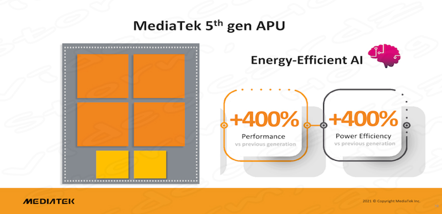 Dimensity 9000에는 MediaTek의 5세대 APU가 탑재되어 이전 세대에 비해 4배의 에너지 효율성을 가지며, 4배 더 강력하다고 알려졌습니다. 새로운 실리콘은 M80 5G 모뎀을 탑재하였으며, 새로운 3GPP R16 5G 표준을 지원하는 동시에 7 Gbps의 다운링크 속도를 지원한다고 합니다.