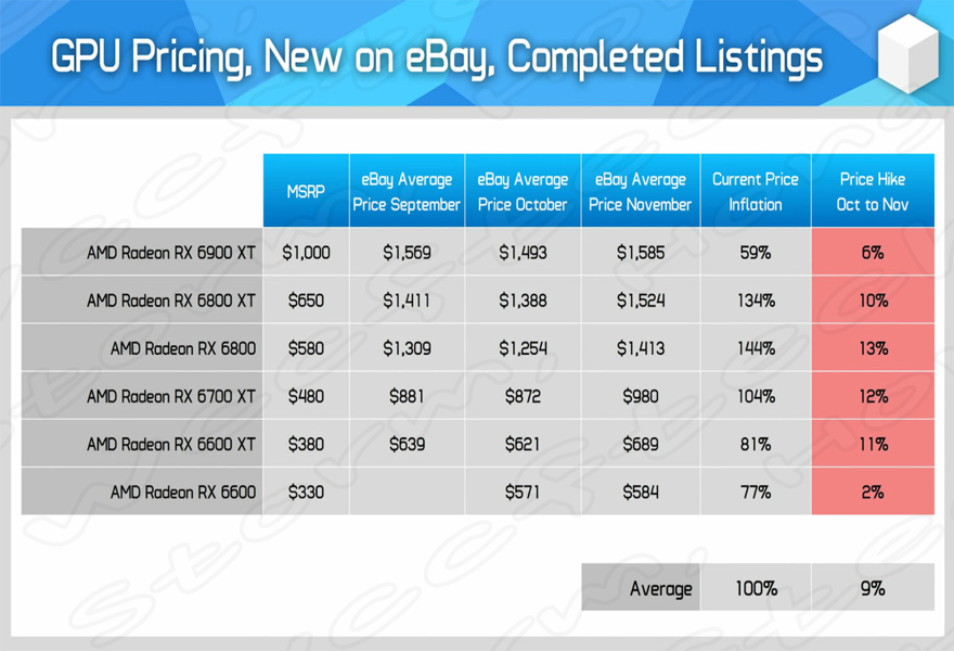 보드 채널 포럼은 AMD RX 6000 시리즈 그래픽 카드는 계속해서 가격이 오를 것으로 보이며 가격 인상으로 인해 모든 AMD Radeon RX 6000 시리즈 그래픽 카드에 영향을 미치며 특정 지역에 국한되지 않을 것이라는 이야기가 알려지고 있습니다. 올해 11월에 AMD Radeon RX 6000 시리즈는 전월 대비 9%의 가격 인상이 적용이 되었으며 최근 10%의 가격 인상은 이달 말에 출시되는 새로운 RDNA 2 GPU 배치에 적용될 예정이라고 알려졌습니다.
