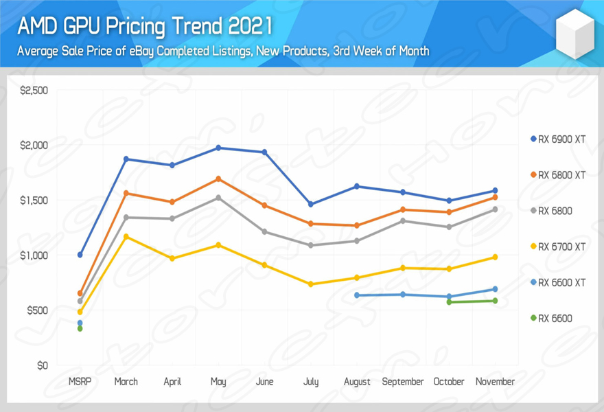 보드 채널 포럼은 AMD RX 6000 시리즈 그래픽 카드는 계속해서 가격이 오를 것으로 보이며 가격 인상으로 인해 모든 AMD Radeon RX 6000 시리즈 그래픽 카드에 영향을 미치며 특정 지역에 국한되지 않을 것이라는 이야기가 알려지고 있습니다. 올해 11월에 AMD Radeon RX 6000 시리즈는 전월 대비 9%의 가격 인상이 적용이 되었으며 최근 10%의 가격 인상은 이달 말에 출시되는 새로운 RDNA 2 GPU 배치에 적용될 예정이라고 알려졌습니다.
