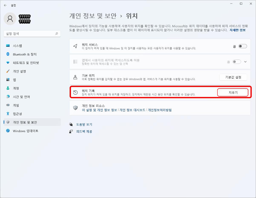 4) 위치 기록 옆에 있는 지우기를 선택해 줍니다.