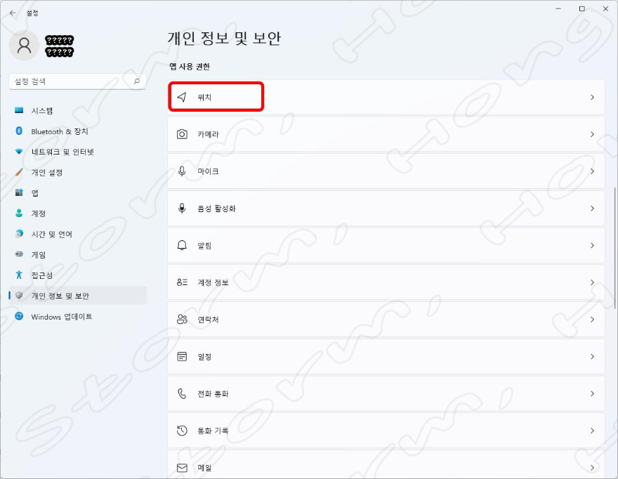 3) 아래로 스크롤하여 앱 권한 색션으로 간 뒤 '위치' 를 선택합니다.
