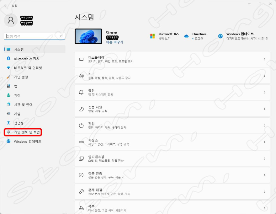 2) 왼쪽 창에서 개인 정보 및 보안을 선택합니다.