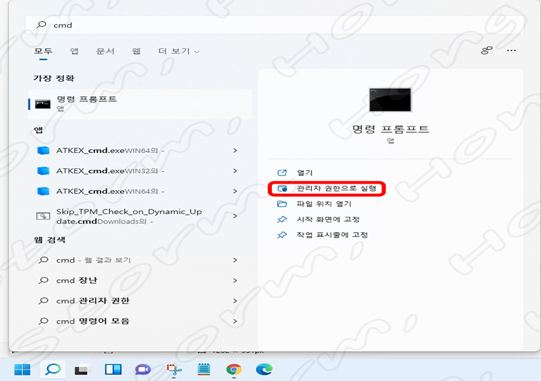2) 돋보기 아이콘 옆 명령어 표시줄에 'cmd' 를 입력한 뒤 '관리자 권한으로 실행' 이라는 화면을 클릭합니다.