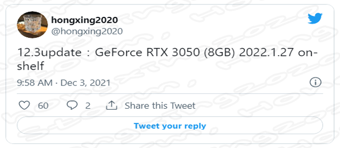 또한 알려진 NVIDIA GeForce RTX 3050 Series (엔비디아 지포스 RTX 3050 시리즈) 의 예상, 예측, 루머, 소문의 출시일은 2022년 1분기에 출시될 것으로 보고 있습니다.St그러면서 이 제품이 준비가 늦어지거나 공백기가 더 생길 수 있기 때문에 NVIDIA GeForce RTX 2060 12GB (엔비디아 지포스 RTX 2060 12GB)를 출시한다는 소식과 함께 많은 사람들이 기대를 하고 있습니다.