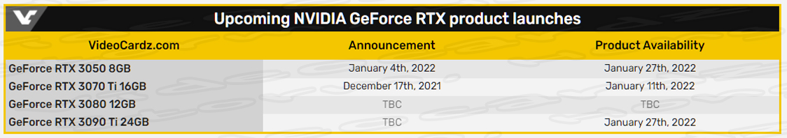 * 중요한 점은 NVIDIA GeForce RTX 3090 Ti (엔비디아 지포스 RTX 3090 Ti), NVIDIA GeForce RTX 3070 Ti 16GB (엔비디아 지포스 RTX 3070 Ti 16GB), 에 대한 출시 정보가 다시 한번 알려졌습니다. 그러나 일전에 알려졌던 NVIDIA GeForce RTX 2060 12GB (엔비디아 지포스 RTX 2060 12GB) 의 정보는 사실이었으며 출시에 대한 정보는 공식 홈페이지에 정보가 기제됨은 물론이고 2021년 12월 8일 출시되었습니다.