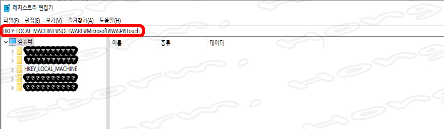 2. 다음과 같이 주소 줄에HKEY_LOCAL_MACHINE\SOFTWARE\Microsoft\WiSP\Touch 를 넣고 '엔터' 를 눌러 줍니다.