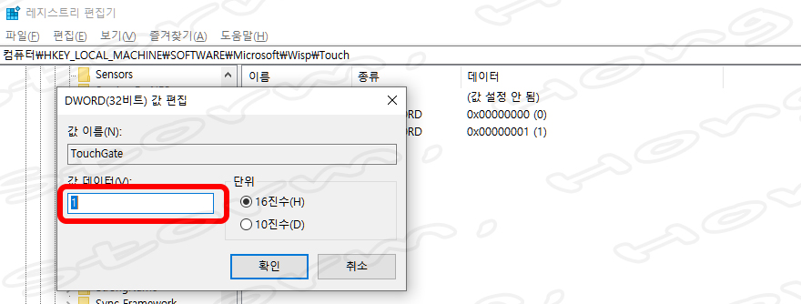터치스크린을 다시 활성화하려면 위의 모든 단계를 진행한 뒤 6번째 수행에서 값 데이터 필드에 0 대신 1을 입력하면 다시 활성화가 가능합니다.