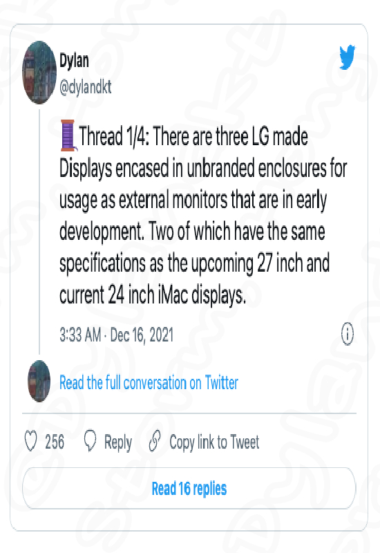 앞에서 언급한 내용에 비추어 본다면 LG는 iMac 기반 모델, 27인치 iMac, 32인치 모델을 포함하여, Apple을 위한 새로운 디스플레이를 개발 중이라는 예상, 예측, 루머, 소문의 정보가 나왔습니다. 이 내용은 트위터 계정 @dylandkt에서 이와 같은 정보를 알렸습니다.