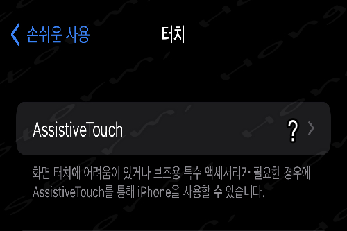 1) 터치를 누른 화면입니다. 'AssistiveTouch' 가 '끔' 으로 되어 있을 수 있습니다.