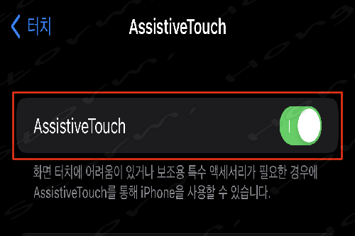2) 'AssistiveTouch' 를 ↓ 사진과 같이 온으로 만들어 줍니다.