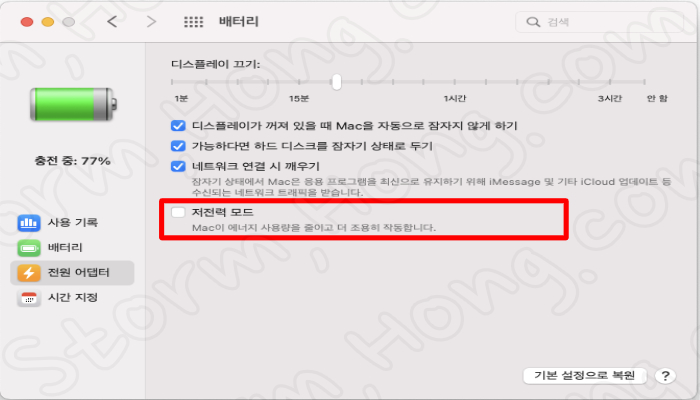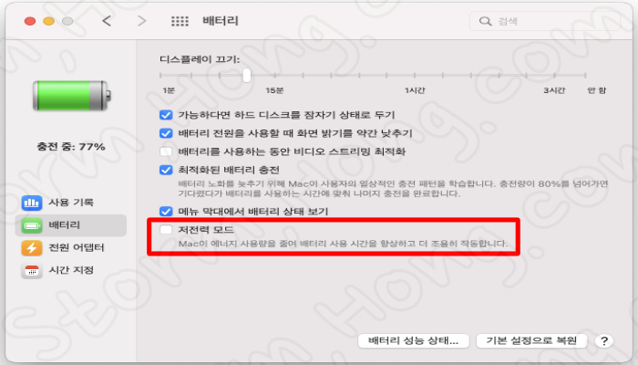 3. MacBook 배터리로 사용하는 경우 왼쪽에서 배터리 옵션을 클릭합니다. 전원이 연결된 상태에서는 저전력 모드를 켜려면 어뎁터를 선택합니다. (또 다른 방법은 독에 있는 시스템 환경 아이콘을 누릅니다. -> 배터리를 누릅니다. 이러면 ↓ 아래와 같은 화면이 나타납니다.)