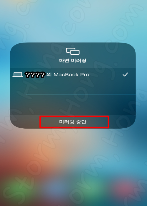 5. 연결된 상태에서 다음 화면과 같이 다시 한번 띠우면, 미러링을 종료할 수 있는 화면이 나타납니다.
