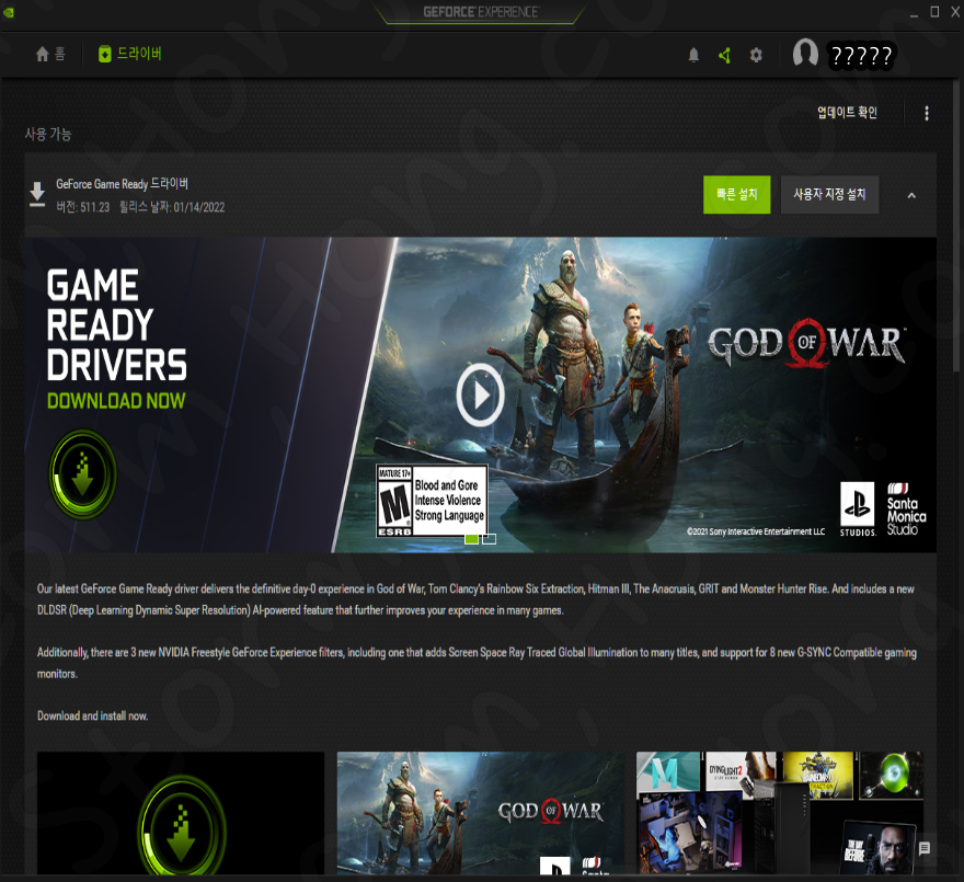 최신 NVIDIA GeForce Driver 511.23 는 2022년 1월 14일 (EST) 업데이트를 진행했으며, 주요 내용으로는 God of War alc Ranbow Six Extraction 에 대한 최적화를 진행하는 업데이트입니다. 그리고 드라이버에는 Hitman 3, The Anacrusis, Monster Hunter Rise 를 중점으로 최적화를 진행했습니다.