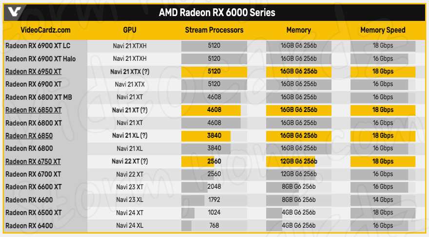 AMD Navi 21 GPU 현재의 AMD Radeon RX 6900 XT, Radeon RX 6800 XT 및 Radeon RX 6800에 전원을 공급하고 Navi 22 GPU 를 사용하는 데스크탑 플랫폼에서는 Radeon RX 6700 XT에 전원을 공급한다고 합니다. 이에 AMD 모바일 라인업과 유사한 GPU 이름 규칙을 사용한다고 사정할 때, 2022년 2분기에 출시될 제품명의 예상, 예측, 루머, 소문으로는 AMD Radeon RX 6950 XT, AMD Radeon RX 6850 XT, AMD Radeon RX 6750 XT 가 될 것으로 보인다는 정보였습니다.