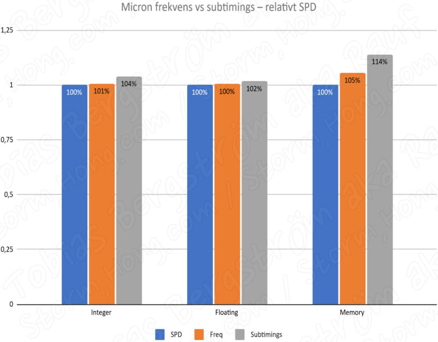하지만 가장 흥미로운 것은 마지막 테스트였습니다. Tobias Bergström aka Rauf 는 마이크론 (Micron) DDR5를 세 가지 다른 구성들과 비교를 했습니다. 하나는 더 높은 주파수를 가진 재고이고 다른 하나는 수정된 피하수를 가지고 있습니다. 피벗 타임라인 조정으로 생산성이 가장 크게 향상되었기 때문에 결과는 명백할 것이라고 합니다. 클럭이 최적화되고 전송 속도가 4800 Mbit/s로 유지되므로 전체 클럭의 최대 4%와 2%의 부동 클럭의 성능을 달성할 수 있다고 합니다. 이를 지원하는 메인보드가 있는 경우, 더 높은 등급의 패키지의 가격과 가용성이 향상될 때까지 저렴한 DDR5-4800 세트를 구입하는 것이 그렇게 나쁜 선택처럼 보이지 않습니다.