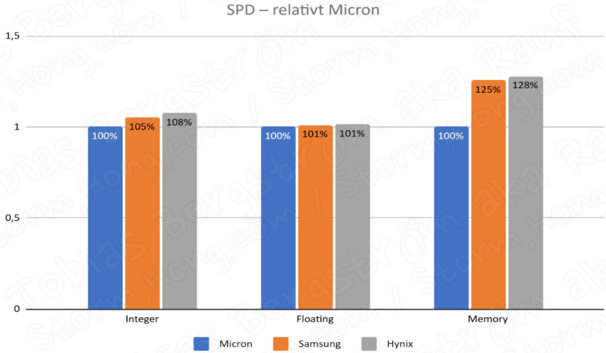 Tobias Bergström aka Rauf 는 메모리 성능을 결정하는 테스트 Geekbench 3 벤치마크를 사용했다고 알려졌으며 DDR4에 비해 메모리 점수가 상승했지만 게임과 같은 애플리케이션에서 가장 많은 형향을 미치는 성능이라고 이야기를 했습니다. 또한 삼성 (Samsung) 과 하이닉스 (Hynix) 제품은 마이크론 제품에 비해 최대 28% 의 메모리 성능을 보여주지만 성능 상승폭은 5 ~ 8%에 불과하다고 알렸습니다.