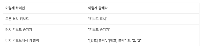 음성 액세스가 가능한 터치 키보드 사용 음성 액세스가 가능한 터치 키보드를 사용하여 다음 작업을 수행하십시오.