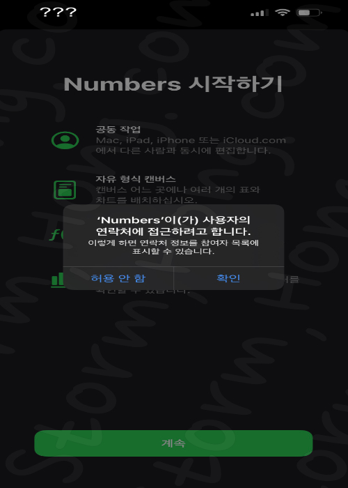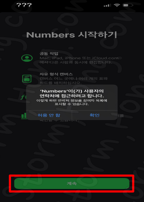 3. 'Number' 실행 후 연락처 연동을 하지 않도록 하려면 '허용 안함' 을 누르고, 확인을 누르면 허용이 됩니다.