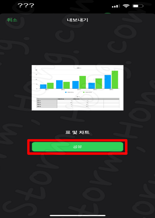 15. 변환이 완료되면 공유 버튼을 탭 하고 Excel 파일을 저장하거나 공유를 지원하는 앱 목록 등 원하는 플랫폼으로 공유가 가능합니다.