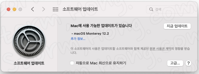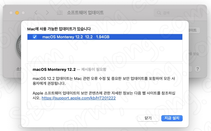 * macOS Monterey 12.2 업데이트 설치 공간은 1.94 GB 입니다. (설치용량은 이전 버전의 업데이트를 하지 않으신 분은 더 큰 용량일 수 있습니다.)