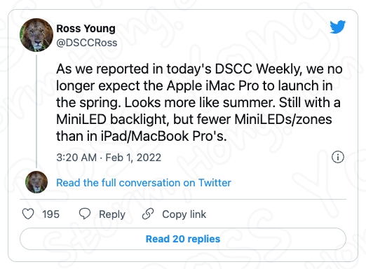 Ross Yong 에 의하면 DSCC가 iMac Pro 는 여름에 미니 LED 디스플레이로 출시될 것으로 예상한다고 이야기를 하면서 트윗에 소식을 공유했습니다. 그러면서 그는 미니 LED 미니 디스플레이 LED 가 새로운 MacBook Pro 모델 및 12.9인치 iPad Pro 에 비해 더 적은 영역을 수용할 것이라는 이야기를 알렸습니다.