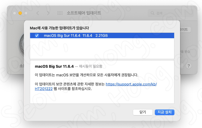 * macOS Big Sur 11.6.4 업데이트 설치 공간은 2.21 GB 입니다. (설치용량은 이전 버전의 업데이트를 하지 않으신 분은 더 큰 용량일 수 있습니다.)