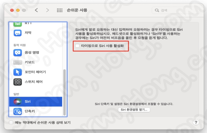 4. 시리를 클릭하면 오른쪽에 'Type to Siri (타이핑으로 시리 사용)' 에 체크를 해줍니다.