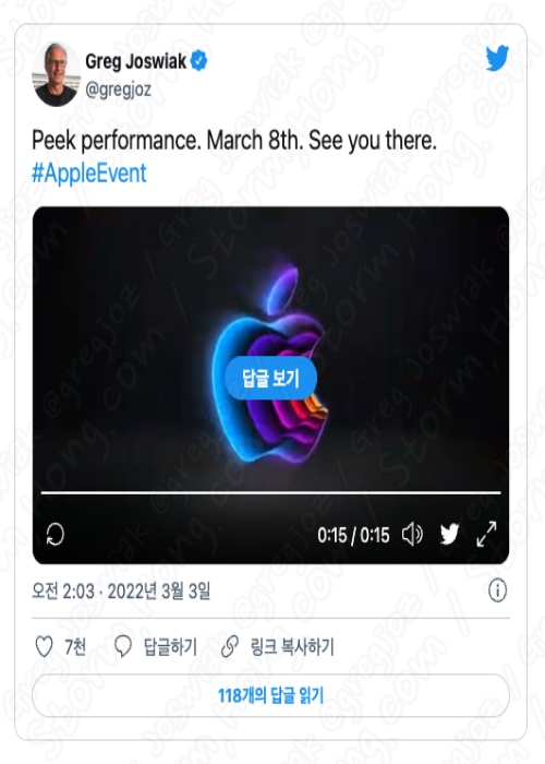 * 중요한 점은 Apple 은 3월 행사를 위해 총력전을 기울이고 있으며, 날짜는 2022년 3월 8일 AM 10:00 (PST) 로 많은 사람들에게 초대장을 보냈습니다. 그 초대장의 제목은 Peek Performance 이며 전 세계 많은 이들이 기대를 하고 있는 만큼 어떠한 제품이 나올지 지켜봐야 할 것으로 보입니다.
