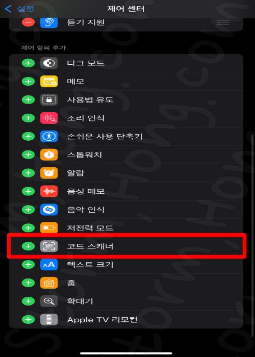 3. 아래로 스크롤하여 '코드 스캐너' 를 찾아준 뒤 왼쪽에 있는 + 부분을 터치해 줍니다.