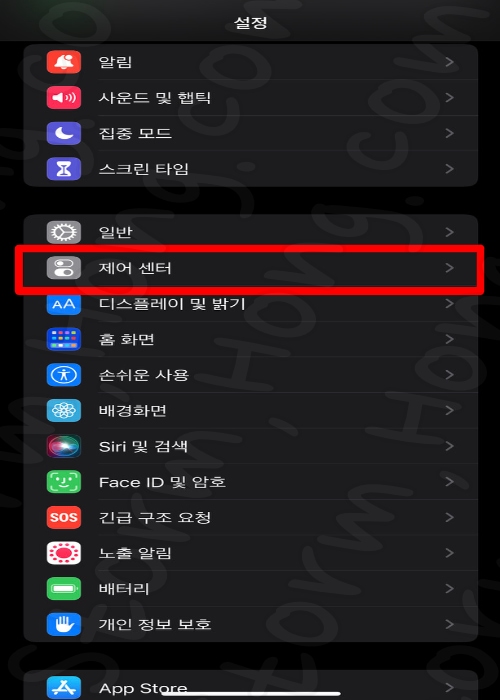 2. 아래로 스크롤하여 '제어 센터' 를 눌러 줍니다.