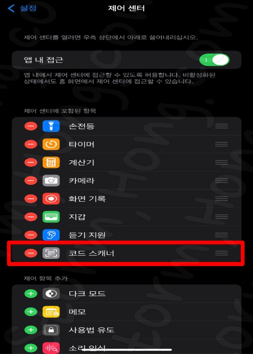 3. 아래로 스크롤하여 '코드 스캐너' 를 찾아준 뒤 왼쪽에 있는 + 부분을 터치해 줍니다.
